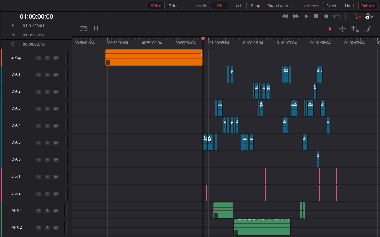 Organize Your Tracks: Don’t just leave clips where they fell. Group them logically into “food groups”—Dialogue, SFX, and Music. Each mixer has their own layout but as long as you keep them organized by food groups and clearly labeled they will be happy. Personally I like DIA at the top then SFX then MFX.